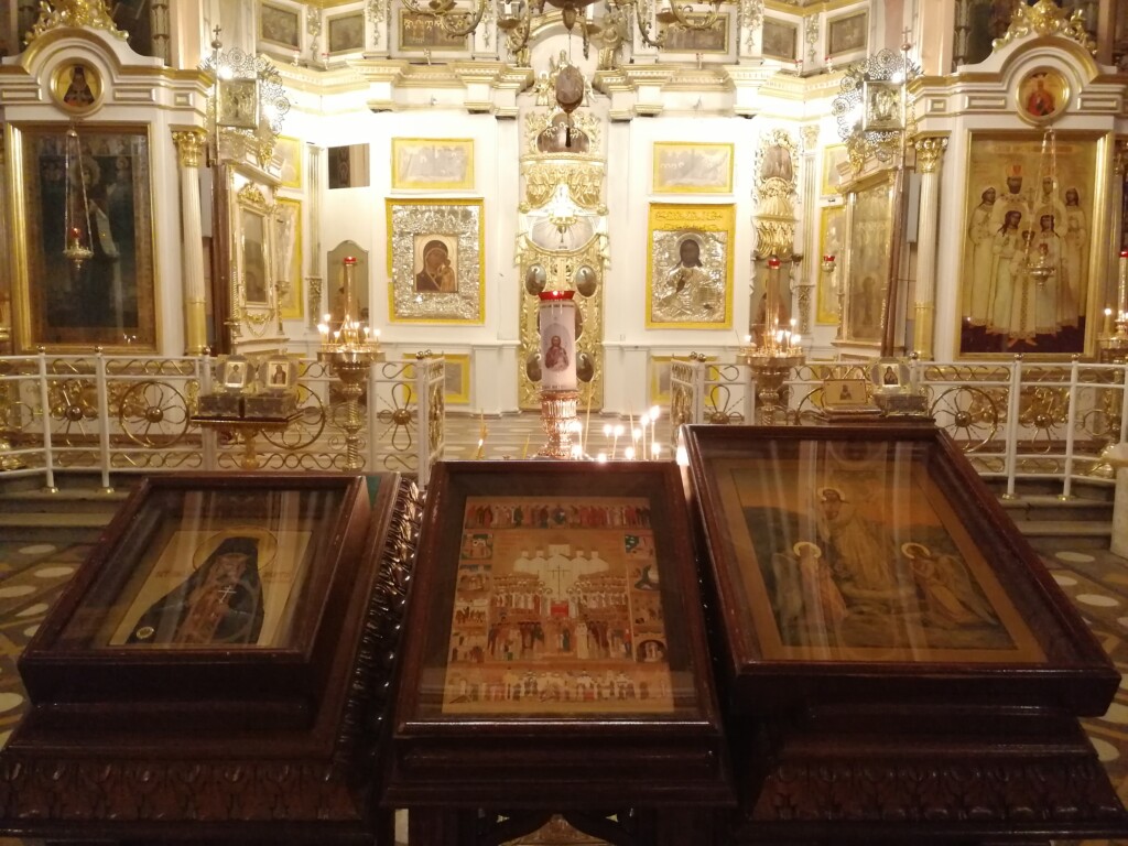 О, святи́и новому́ченицы и испове́дницы Росси́йстии: святи́телие и па́стырие Це́ркве Христо́вы, ца́рственнии страстоте́рпцы, благове́рнии кня́зие и княги́ни, до́блии во́ини, мона́си и мирсти́и, благочести́вии му́жие и жены́, во вся́цем во́зрасте и сосло́вии за Христа́ пострада́вшии, ве́рность Ему́ да́же до сме́рти свиде́тельствовавшии и вене́ц жи́зни от Него́ прия́вшии! Вы во дни гоне́ния лю́таго, зе́млю на́шу от безбо́жных пости́гшаго, на суди́щах, в заточе́ниих и про́пастех земны́х, в го́рьких рабо́тах и вся́ких ско́рбных обстоя́ниих о́браз терпе́ния и непосты́днаго упова́ния му́жественне яви́ли есте́. Ны́не же, в рай сла́дости наслажда́ющеся, пред Престо́лом Бо́жиим во сла́ве предстои́те и при́сно хвалу́ и хода́тайство со А́нгелы и все́ми святы́ми Триеди́ному Бо́гу возно́сите. Сего́ ра́ди мы, недосто́йнии, мо́лим вас, святи́и сро́дницы на́ши: не забу́дите земна́го оте́чества ва́шего, грехо́м Ка́инова братоуби́йства, поруга́нием святы́нь, безбо́жием и на́шими беззако́нии отягче́ннаго. Умоли́те Го́спода Сил, да утверди́т Це́рковь Свою́ непоколеби́му в ми́ре сем многомяте́жнем и лука́вом; да возроди́т в земли́ на́шей дух ра́зума и благоче́стия, дух свя́тости и стра́ха Бо́жия, дух братолю́бия и ми́ра; да па́ки бу́дем мы ца́рское свяще́ние, род Бо́жий, избра́нный и святы́й, при́сно с ва́ми сла́вящий Отца́ и Сы́на и Свята́го Ду́ха во ве́ки веко́в. Ами́нь.