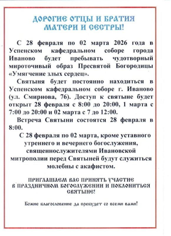 Размещено 14.02.2026 в 744 × 1024 в С 28 февраля по 02 марта 2026г. — пребывание чудотворной иконы «Умягчение злых сердец» в Успенском кафедральном соборе. Объявление.